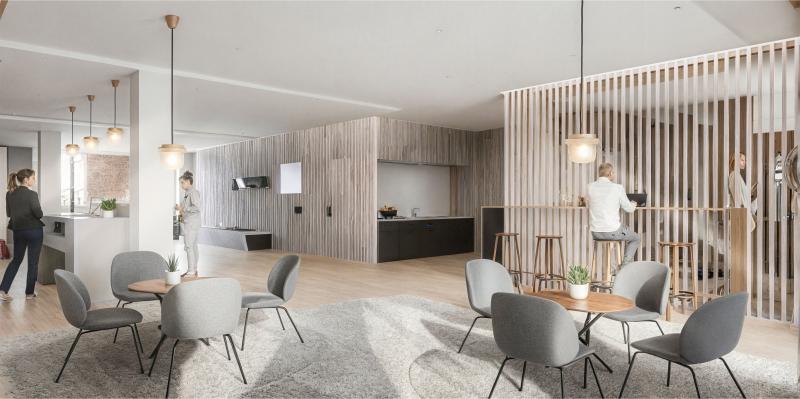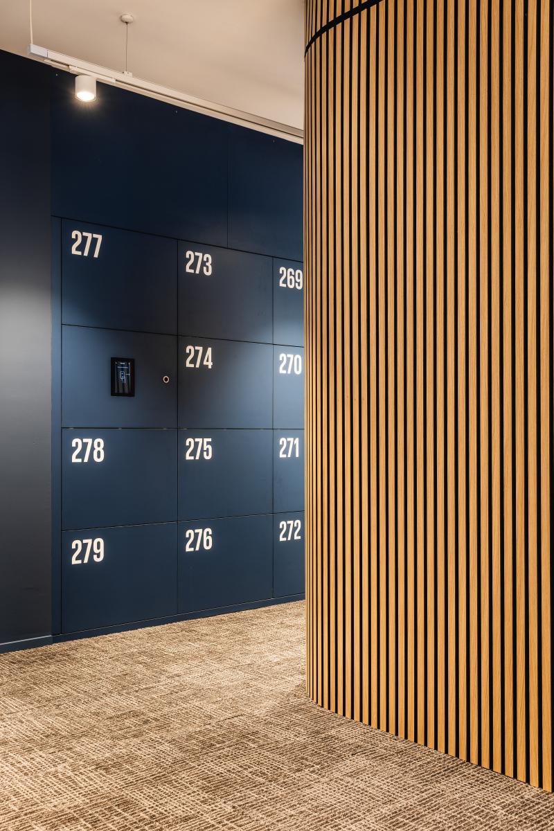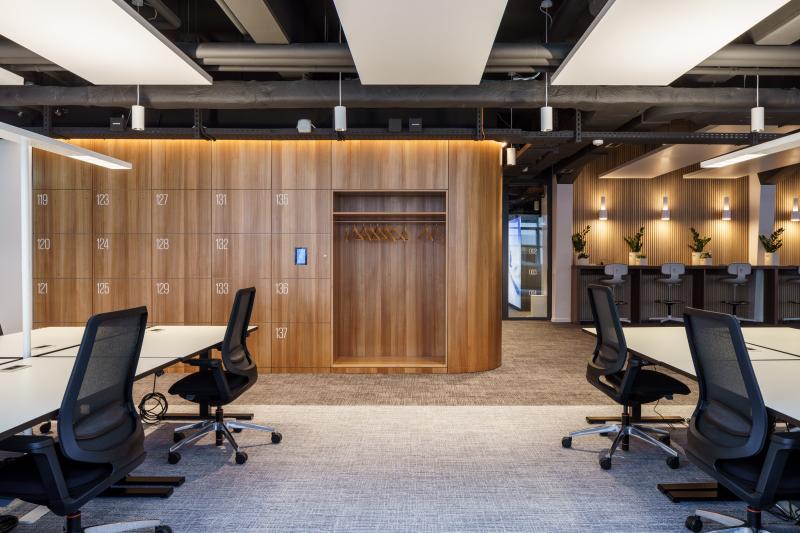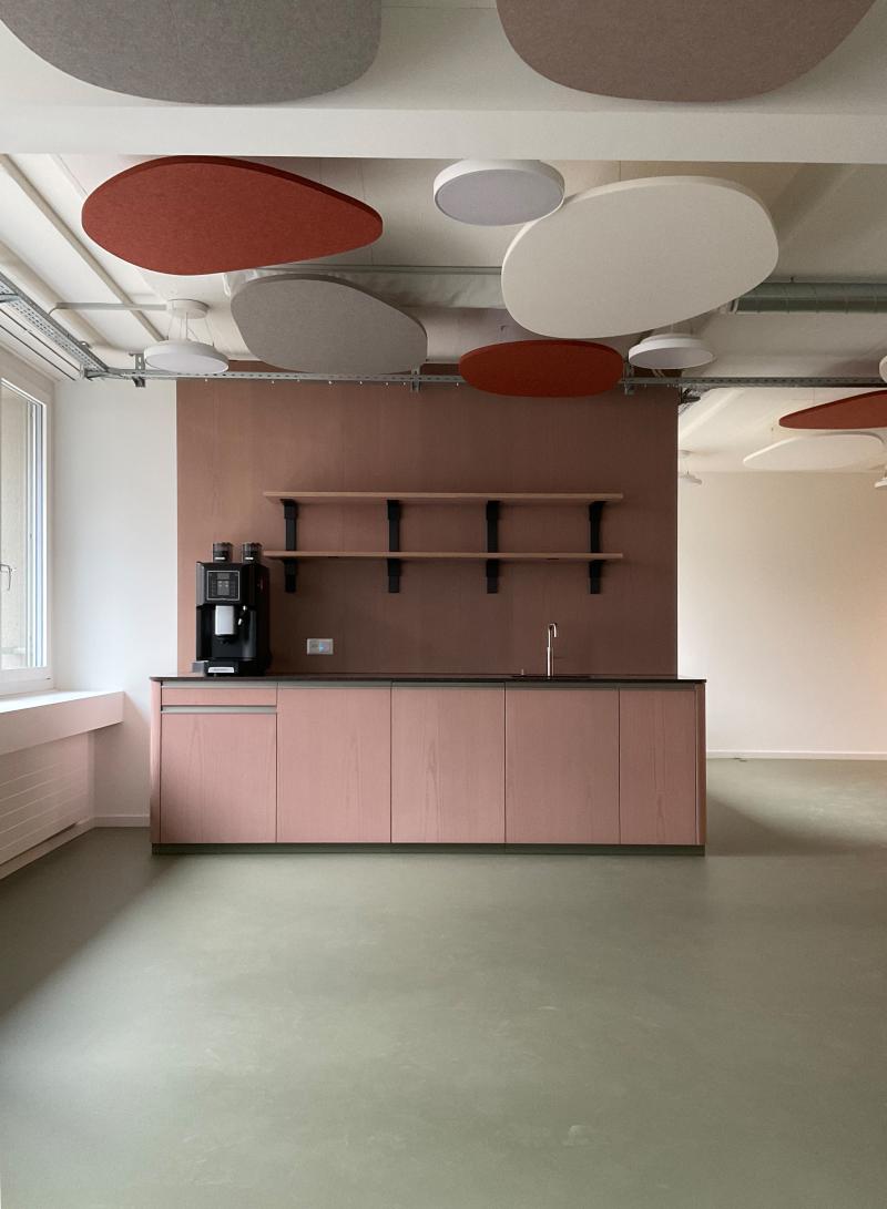 Peripher angeordnete Arbeitsplätze, Besprechungszonen und flexible Trennwände schaffen eine klar strukturierte, dynamische Raumfolge mit hoher Kundenorientierung.