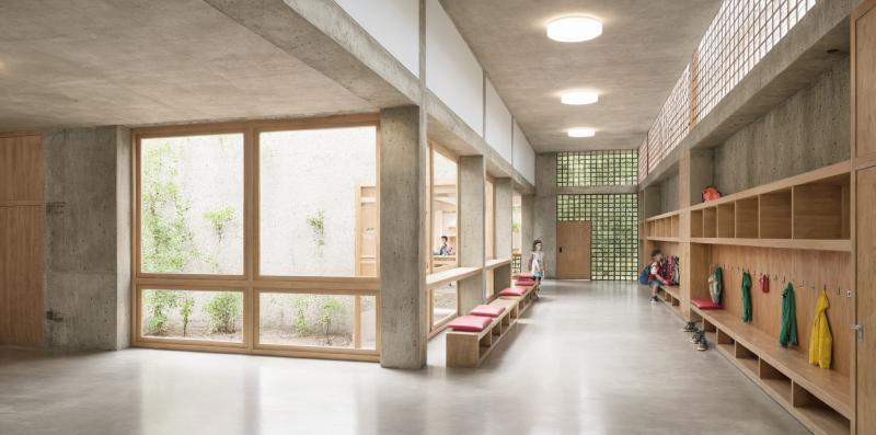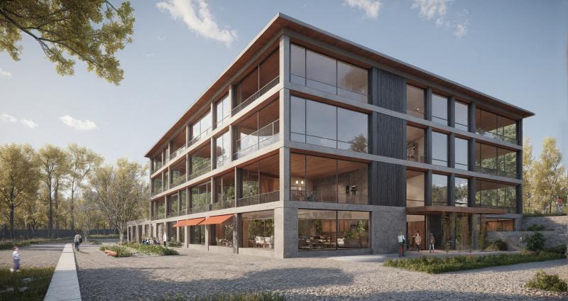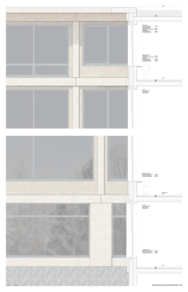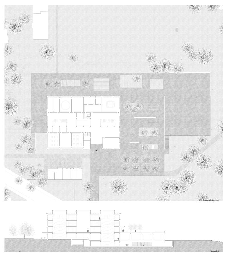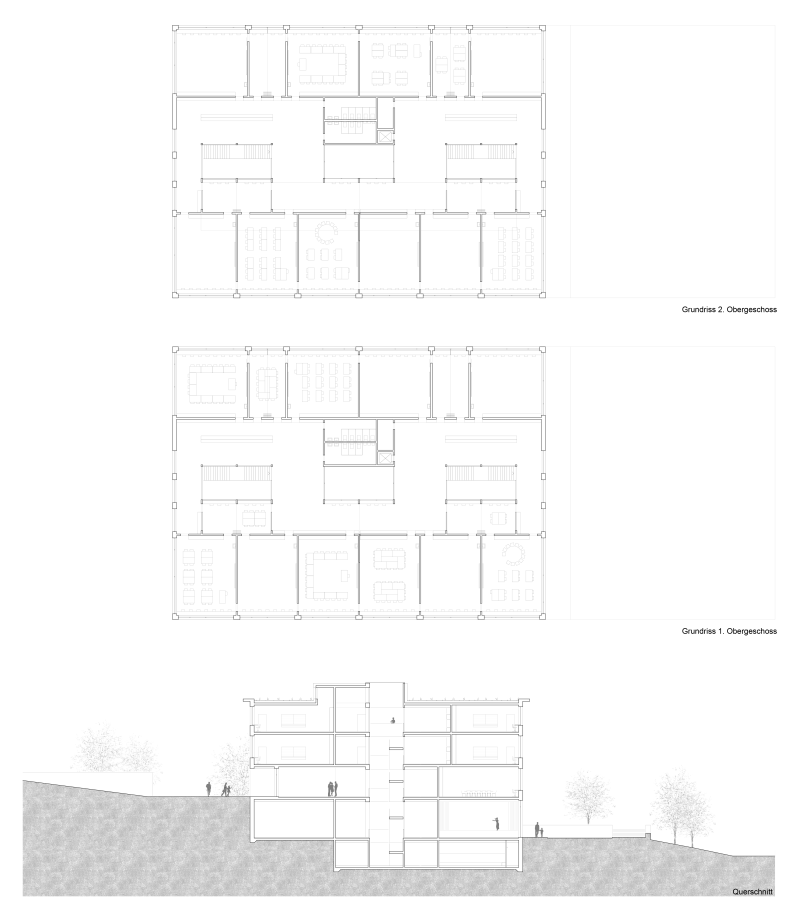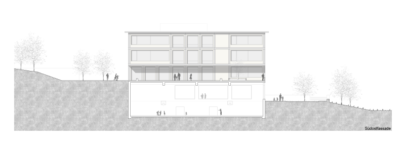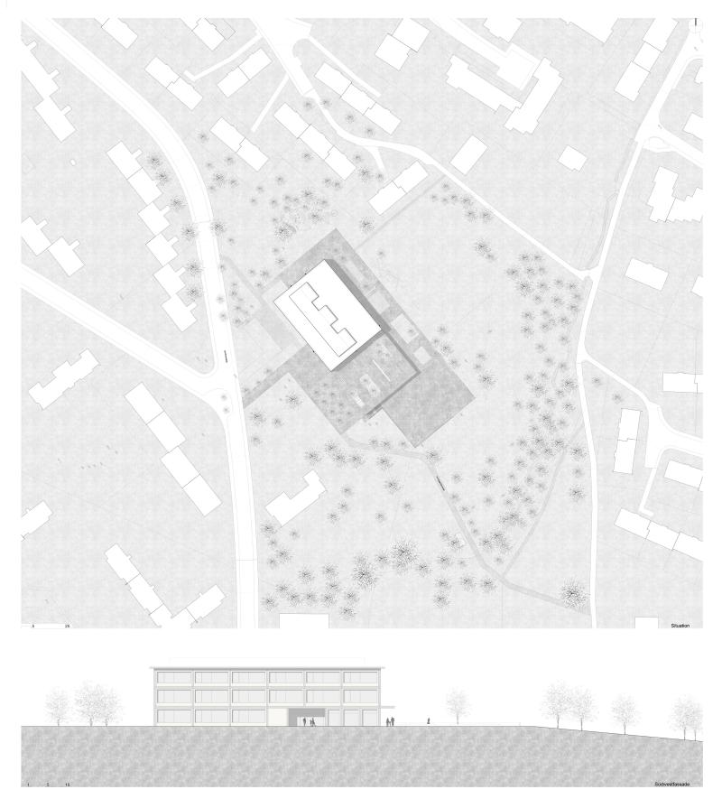 In Zusammenarbeit mit Wildrich Hien Architekten wurde ein Schulhaus konzipiert, das aus einem flachen Turnhallenbau und einem höheren Gebäude für Unterrichtsräume besteht. Der Pausenplatz liegt auf dem Turnhallendach und ist öffentlich zugänglich, der Haupteingang befindet sich an der Lerchenhalde. Externe Nutzer der Turnhalle und des Mehrzwecksaals im Untergeschoss können störungsfrei das Gebäude betreten. Die Schule ist zweihüftig organisiert, mit Unterrichts- und Gruppenräumen an den Aussenseiten und einer belichteten Erschliessungszone mit Lichthöfen dazwischen, die Sichtbeziehungen zwischen den Geschossen schafft. Obere Geschosse bieten kompakte Klassen- und Betreuungsräume, die flexibel zusammenschaltbar sind. Im Erdgeschoss befinden sich Personal- und Fachräume sowie die Biblio-/Mediothek mit direktem Bezug zum Pausenplatz. Das erste Untergeschoss gliedert sich in Mensa, Betreuungsräume und Mehrzwecksaal mit Zuschauerbereich, getrennte Zugänge ermöglichen autarke Nutzung durch externe Gäste. Das Gebäude reagiert auf die Topografie, schafft interaktive Lernräume und hält so das Volumen für das Quartier in einem quartierverträglichen Rahmen.