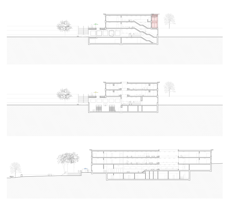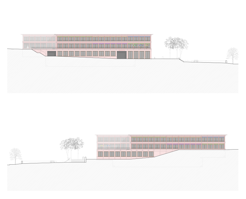 Der Neubau der Schulanlage Seefeld fügt sich mit einem länglichen, kompakten Volumen harmonisch in die bestehende Bebauungsstruktur ein. Er nimmt die Großmassstäblichkeit der angrenzenden Industriebauten auf und vermittelt durch volumetrische Einschnitte sowie eine der Topographie folgende Terrassierung zur angrenzenden Wohnbebauung.