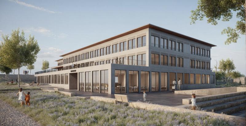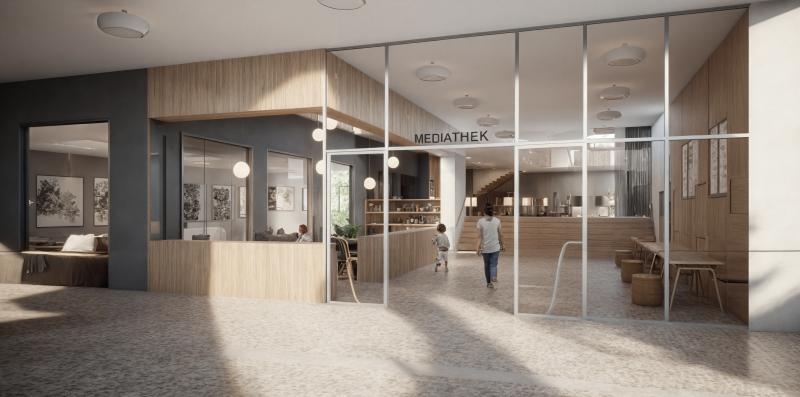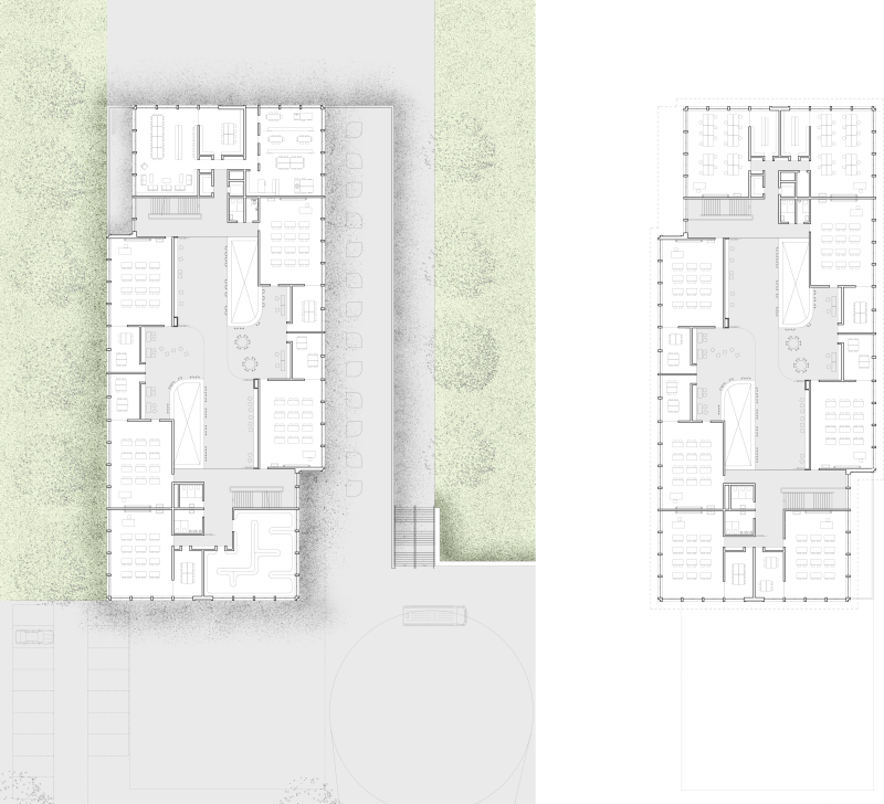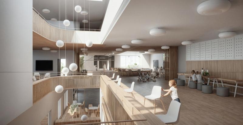 Alle Klassenzimmer sind gleichwertig ost-west-orientiert, optimal belichtet und direkt mit Gruppenräumen verbunden. Das Herzstück des Neubaus bildet eine flexibel nutzbare, innenliegende Lernlandschaft mit Lichthöfen, die vielfältige Unterrichtsformen ermöglicht und auf zukünftige Entwicklungen reagieren kann.