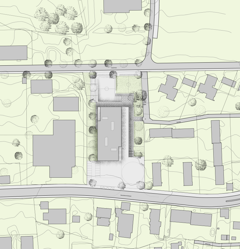 Zur Romanshornerstrasse entsteht ein städtisch geprägter Vorbereich, während die Zugänge von der See- und Rehwegseite als grüne Aussenräume gestaltet sind. Ein umlaufendes Raster und horizontale Bänder gliedern das monolithische Gebäude. Zwei Hauptzugänge erschliessen das Haus beidseitig.